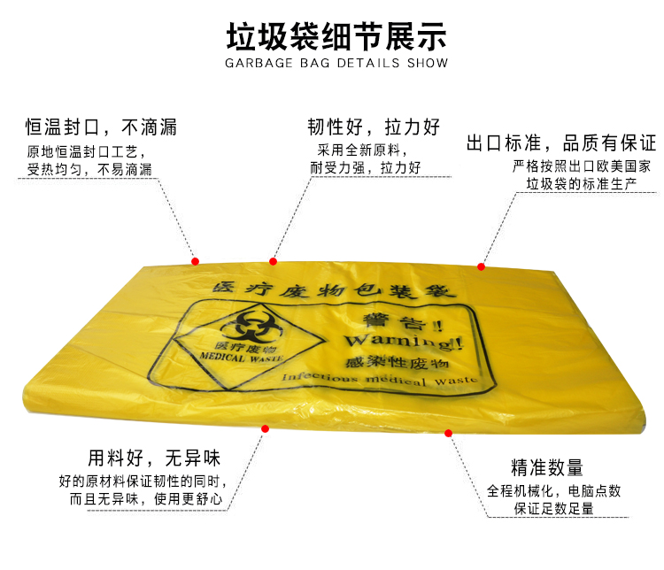 医疗垃圾袋是用于收集医疗废物的专用袋子,主要用于医疗机构或个人家庭中收集和处理产生的医疗废物。医疗废物是指在医疗保健过程中产生的具有传染性、有毒性或其他危害性的废弃物,需要进行专门处理和处置,以防止对环境和人类健康造成危害。使用医疗垃圾袋可以有效地对医疗废物进行分类、包装和运输,确保安全处理和处置。在使用过程中,请按照相关规定正确分类、封装和处理医疗废物,确保环境卫生和公共安全。